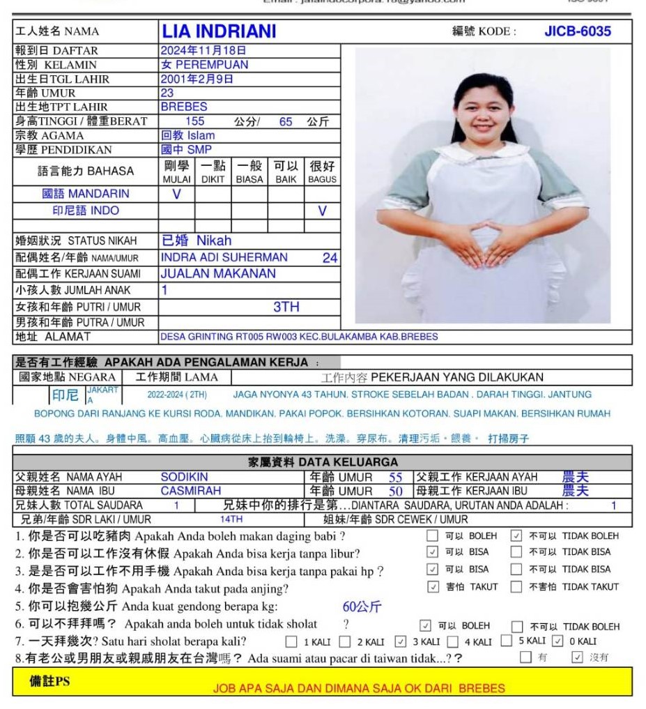 2021-2023 曾經在印尼擔任幫傭,協助雇主打掃、洗燙衣服及煮飯,願意學習照顧病人。