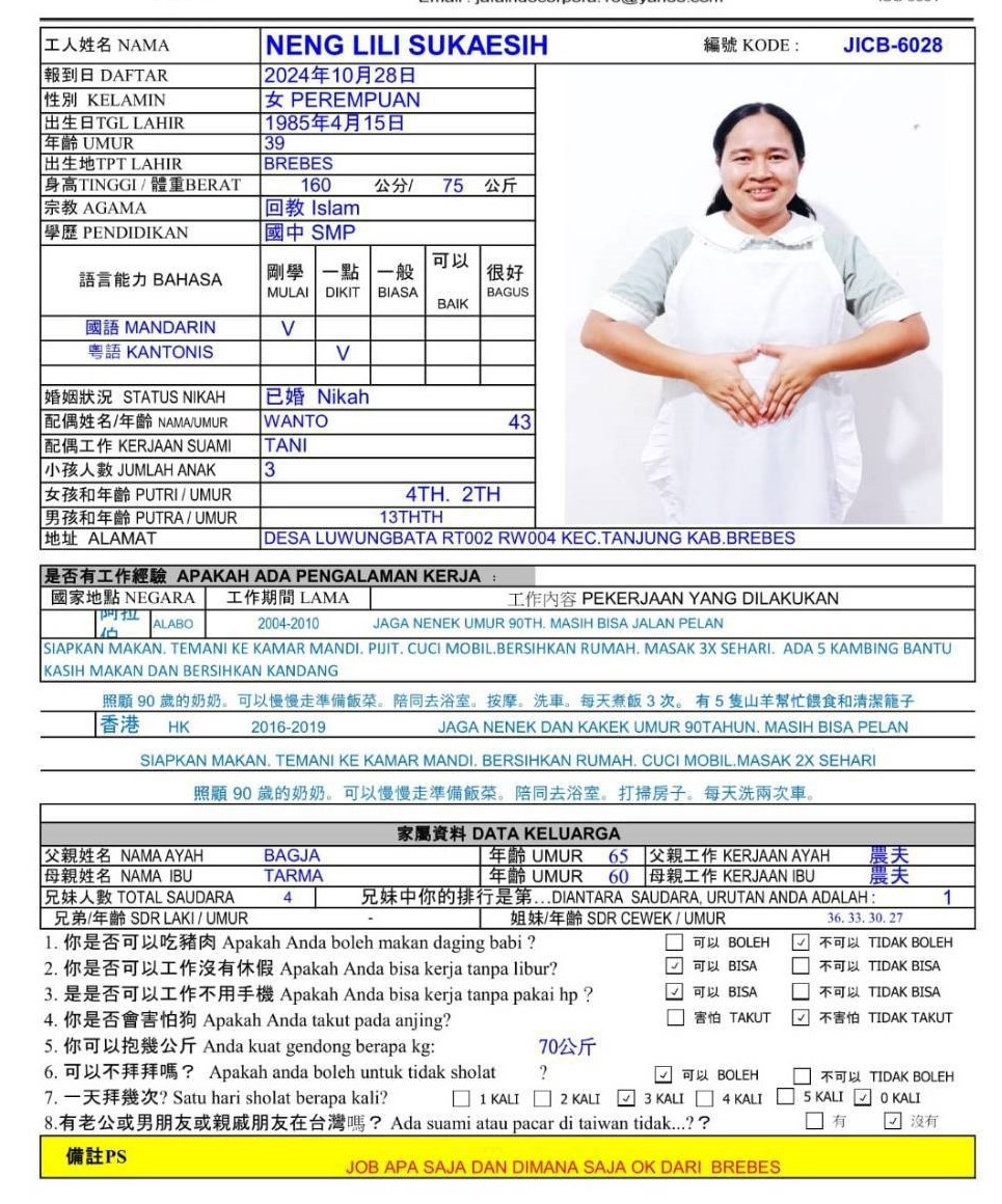 2013-2016 曾經在印尼擔任幫傭,協助雇主照顧2個小孩,打掃、洗燙衣服及煮飯,願意學習照顧病人。