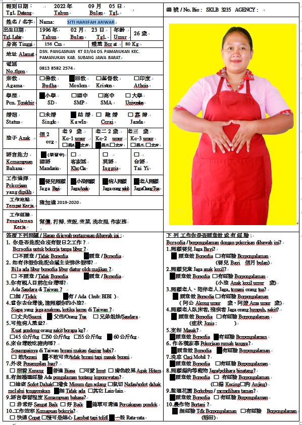 2019-2022 曾經在印尼擔任幫傭,照顧雇主家裡1個4歲小孩及協助家務、三餐飲食。