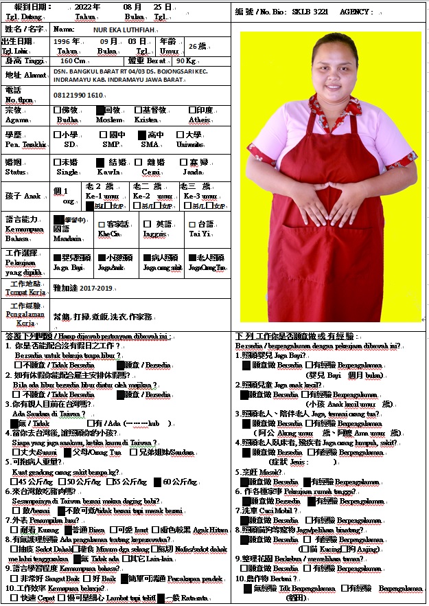 曾經在印尼擔任幫傭3年,協助雇主家整理環境及家務,願意學習照顧病人洗澡、餵藥及三餐飲食。